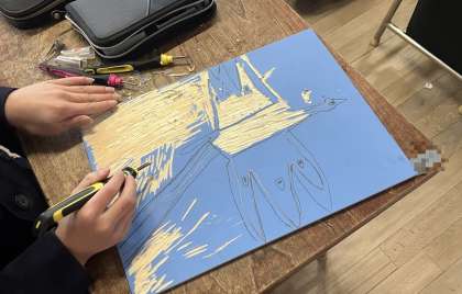 4年生の図工の授業風景です。鳥の版画を作成します。各々に書きたいと思う鳥を調べて下絵を起こし、板に転写して掘っていきます。どの子も集中して丁寧に作業をしていました。