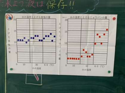 グループ毎で調べた結果を、グラフにシールを貼って現し、考察しました。水温によってミョウバンの溶ける量が違うことを視覚的に捉えることができました。