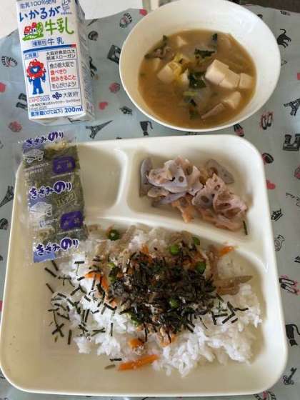 「鶏ごぼうご飯」は、しょうが汁で下味をつけた鶏ひき肉を主材に、つきこんにゃく、ごぼう、にんじん、グリーンピースを使用しています。児童生徒に大変好評な混ぜご飯です。