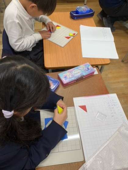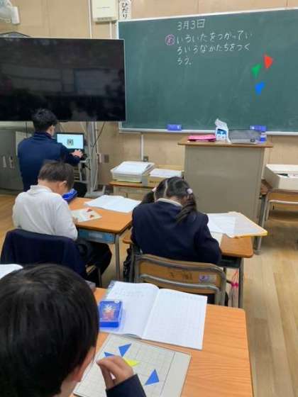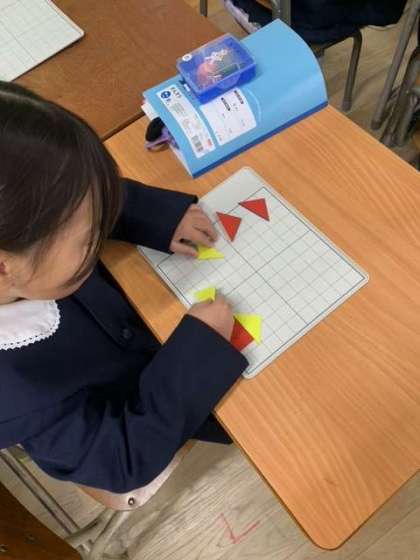 三角形の色板をつなぎ合わせて、色々な形や模様を作りました。