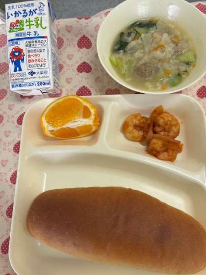 「中華がゆ」は、肉だんごを使った児童生徒に好評な献立です。大根、にんじん、しいたけ、彩りにチンゲンサイを使っています。ごま油を使用することで中華らしさを出しています。