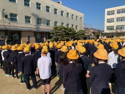 雨や曇りの週初めが続いていましたが、久しぶりに快晴のスタートです。晴れ空のもと、運動場で児童朝会を行いました。