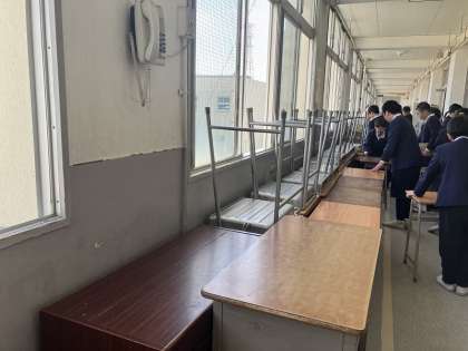 掃除の時間の様子です。年度末も近いので大掃除を行うクラスも多いです。机を運び出し、棚の裏やモニター周りの誇りの掃除を行うクラスもありました。