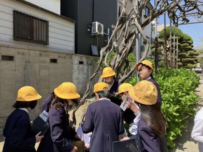 4年生の理科の授業の様子です。「春の生き物探しビンゴ」をしています。校舎裏の花壇や学習園の周りなどを調べてパソコンのカメラ機能で撮影します。ダンゴムシを夢中になって撮っている子もいました。