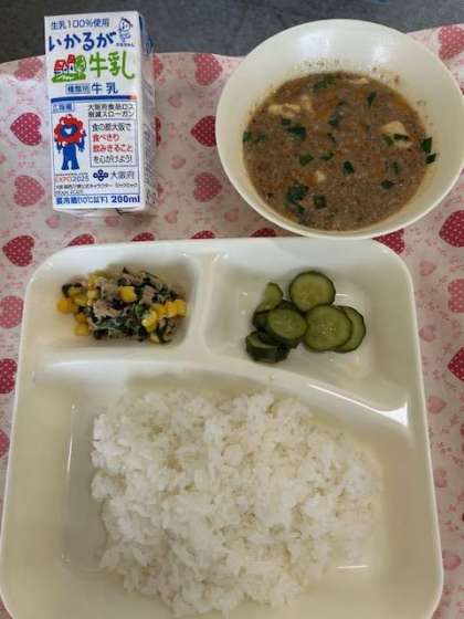 「マーボーどうふ」は、中国の四川料理の代表的な料理です。給食では赤みそやしょうゆなどで味付けし、トウバンジャンでからみを付けています。