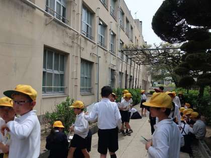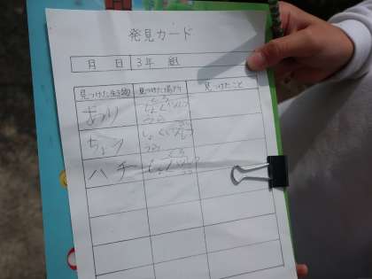 3年生の理科の授業風景です。「生き物探し」をしています。天気が良く、暖かい日が続いているので、生き物の動きが活発になってきています。低学年はどの学年もそんな生き物の様子を観察し、特徴や生態を自分なりに分析します。「もう3種類も見つけたよ!」嬉しそうにカードを見せてくれる子もいました。
