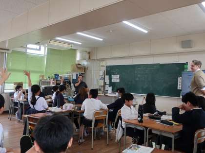 6年生の外国語授業の様子です。班に分かれて、「人物当てクイズ」を作ります。例文を見ながら、お題となる人物の特徴を英語で表現します。多くの児童が手を挙げて例文のクイズに答えていました。