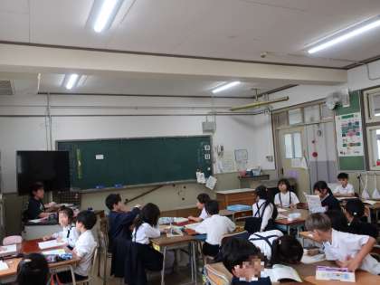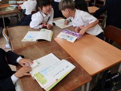 2年生の国語授業の様子です。班に分かれて交代で音読をしています。みんな大きな声で読めていました。呼ぶ場所がわからなくなってしまった子には、周りのお友達が「ここだよ」と優しく声をかけてくれています。