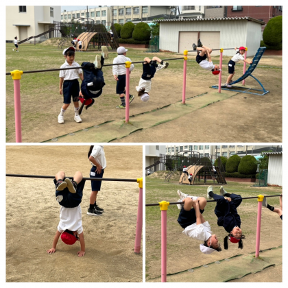 鉄棒にぶら下がったり、先生や友だちに教えてもらったりして、よくがんばっていました。