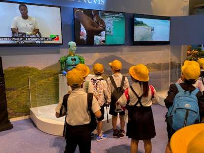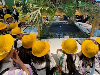 本日は3・5年生の万博遠足の日です。会場はよく晴れていて暑いくらいの気候です。来場者がとても多いですが、児童はマナーを守ってパビリオンを見学しています。