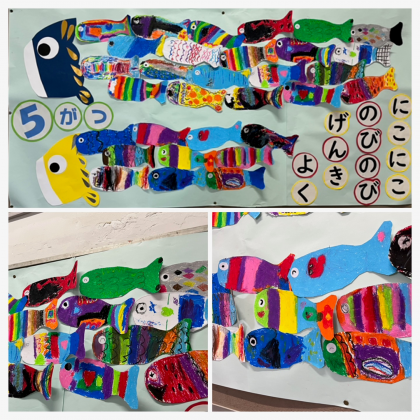 階段の掲示板に、1年生がつくったカラフルな鯉がたくさん掲示されています。
