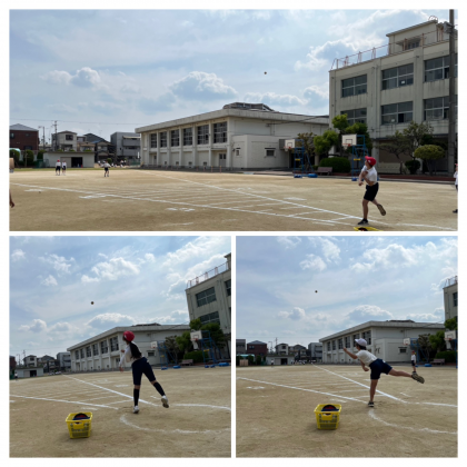 今日は、6年生がソフトボール投げをしていました。