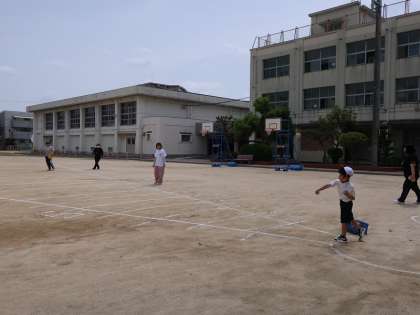 1年生のスポーツテストの様子です。初めてのスポーツテストですが、みんな元気とやる気いっぱいで頑張っています。測定を待っているときも、行儀よく座って待っています。
