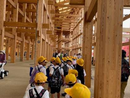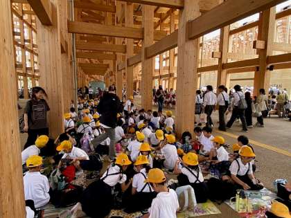 2年生は本日、春の遠足に行っています。暑い中ですが、元気に現地で過ごしています。お弁当は大屋根リングの下で食べます。