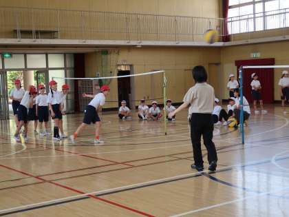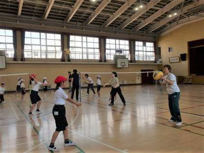 5年生の夢授業の様子です。元バレーボール日本代表・大谷佐知子選手に、バレーボールの講義と実技指導をしていただきます。フォームの確認など、基礎的なところから、サーブ練習等の実践的なものまで、丁寧にご指導下さいました。児童も楽しく授業を受けています。