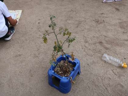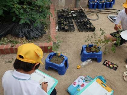 2年生の生活科授業の様子です。育てているミニトマトの観察カードを書いています。毎日、収穫を待ち望みながらお世話をしています。すでに青い実がなっている子もいて、嬉しそうに教えてくれました。