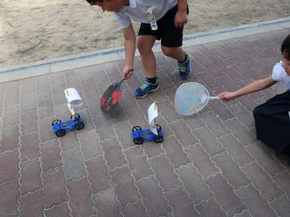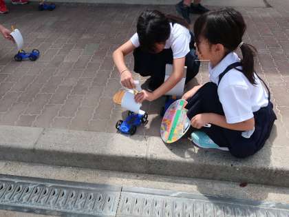 3年生の理科の授業風景です。「風のはたらき」という単元の学習で、風を受けて走る車を使って実験をしています。帆の形を工夫して、どんな形だと速く走れるかをいろいろ試します。各自に創意工夫が見られ、友達とも意見を交換していました。