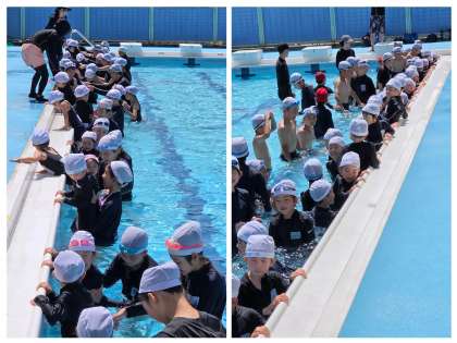 1年生にとって、初めての小学校の大きなプール。6年生の存在は心強かったことでしょう。