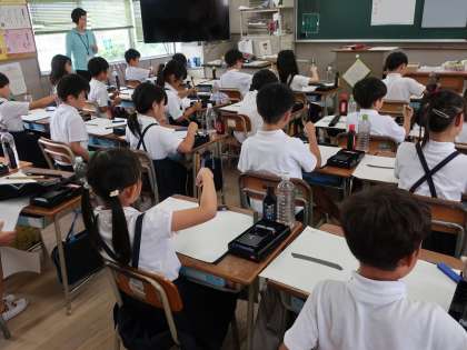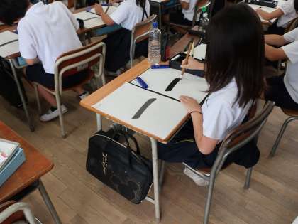 3年生の書写の授業の様子です。漢数字の「一」を書きます。まだ始まったばかりの習字の授業ですが、どの子も先生のお話を聞きながら、集中してていねいに書いていました。