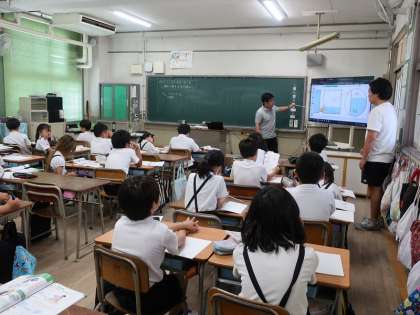 4年生の算数の授業の様子です。「少数のしくみ」という単元を学習しています。0.1より、さらに小さな数について学びました。どの子も教材を見ながら、しっかり話を聞いています。