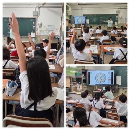このような問題をみんなで考えました。また、「12時から1時間30分たつと何時何分かな?」という問題には、たくさんの子どもが手を挙げていました。