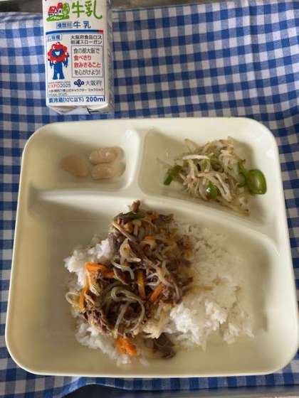 「牛丼」は、牛肉、糸こんにゃく、玉ねぎ、にんじん、えのきたけをいため煮にし、甘辛く味つけしています。
