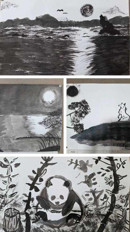 墨汁の濃淡やかすれ、にじみ、描線の動きで絵を表現しています。
