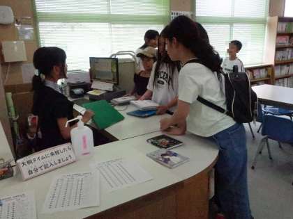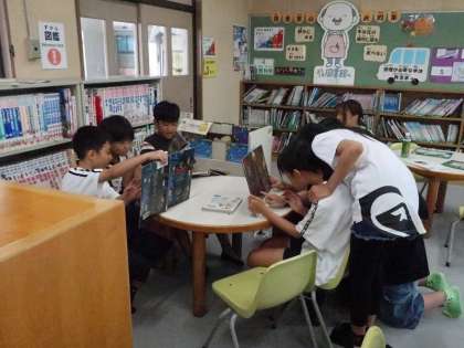大桐小学校では夏休み中、図書館開放を行っている期間があります。多くの児童が訪れ、本の貸し借りや閲覧を行います。本日も大変活気のある様子となっています。