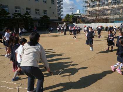 毎週木曜日の大桐タイムには、全校児童が運動場に出て、大なわやなわとびをして体を動かしています。