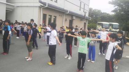 朝のつどいをしました。みんな元気に体操です。少し眠そうですが、朝食をしっかりとり、モクモクファームに向けて出発しました。