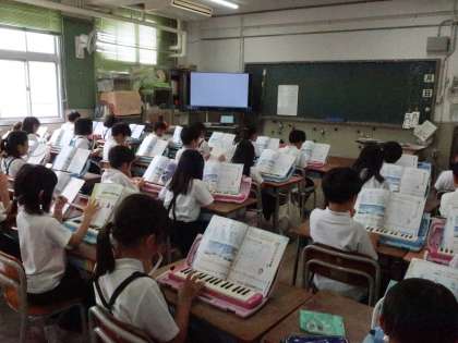 2年生の音楽の様子です。「ぷっかりくじら」という曲を鍵盤ハーモニカで演奏します。先生のオルガンに合わせて、一緒にタイミングよく吹きます。難しそうにしている子も、一生懸命、オルガンについて行っていました。