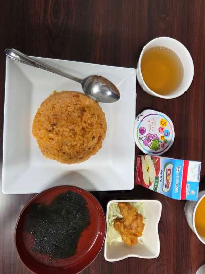 チキンライス、から揚げ、わかめスープ、ぶどうゼリー、アップルジュースです。