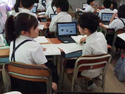 場面の登場人物の気持ちの変化を、パソコンや挿絵を使いながら考えました。音読では全員が声を合わせて、場面に合う読み方をし、とても上手でした。友達と話し合いをしながら、ワークシートを進めました。