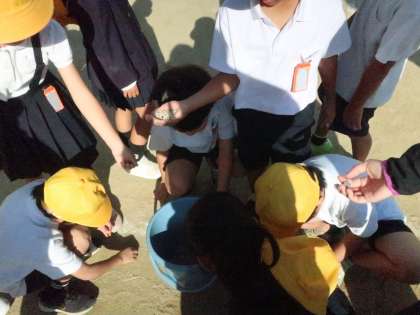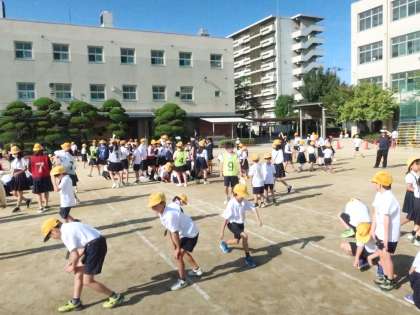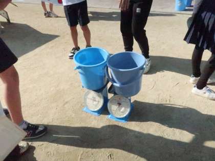 運動会の練習にともない、集会委員が運動場の石拾いを児童集会のゲームにし、学年対抗で拾った小石の重さ比べをしました。運動会の練習が安全にできるように、大きな石やとがった小石がないか地面をよく見ながら活動していました。