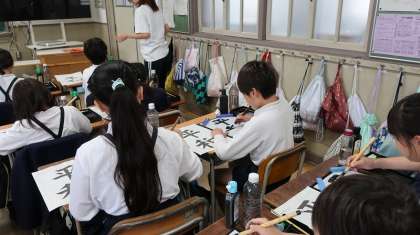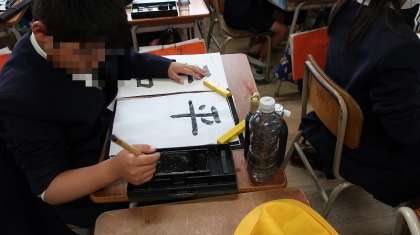 4年生の書写の様子です。毛筆で「平和」と書きます。1画1画確認しながら、丁寧に書いています。