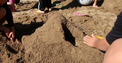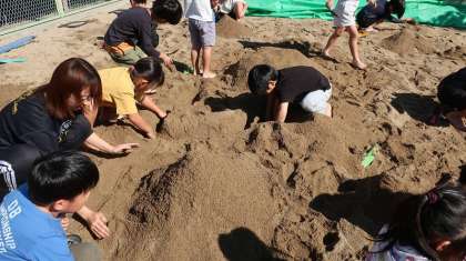 1年生の生活科授業の様子です。泥んこ遊び行っています。トンネルやきれいな泥団子や大きな山など、友達と楽しそうに作っていました。