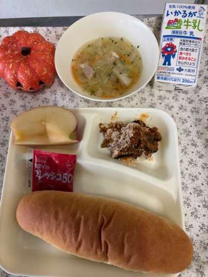 「なすのミートグラタン」は、なすを牛挽肉、豚挽肉、マカロニ(米粉)、玉ねぎとともにケチャップ味のグラタンにしています。