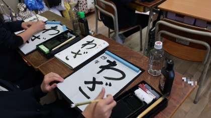 4年生の書写の授業風景です。毛筆で「わざ」と書きます。上下のバランスや文字の中心をそろえることを意識して書いています。集中して丁寧に取り組んでいました。