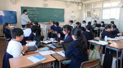 子どもたちは、タブレットを使ってまずは自分で考えました。それから、自分の考えを班で伝え合い、最後に全体で考え方を発表しました。