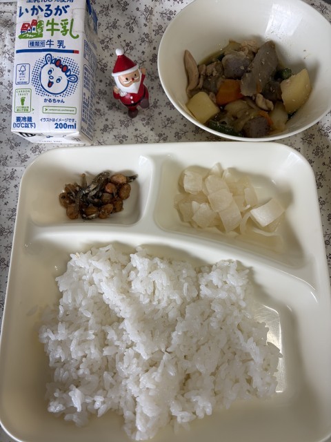 「じゃこ豆」はゆでたちりめんじゃこと、でん粉をまぶしてなたね油であげた大豆に、甘辛い調味液をからませます。かみごたえのある献立です。