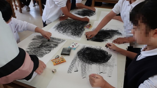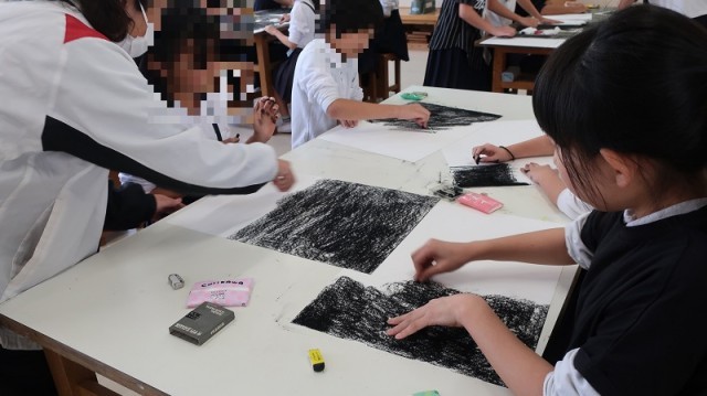5年生の図画工作の授業風景です。画用紙をパステルですべて塗りつぶした後、それを削って、白い線で絵をかきます。