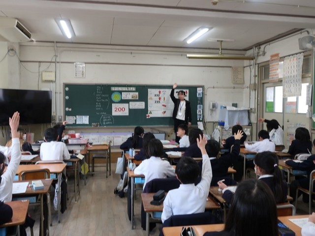 4年生の食育授業の様子です。「おやつについて考えよう」というテーマで学習しました。おやつの1日の摂取基準200キロカロリーまでで、どのような食べ物なら200キロカロリーを超えずに食べられるかを考えました。意外なおやつにカロリーが多いことに驚く児童もいました。また、体にいいおやつは何かを考え、「お餅」「苺」「野菜のおせんべい」等の意見が出ました。