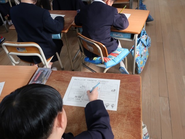 1年生の食育授業の様子です。「きゅうしょくができるまで」というテーマで学習しています。自分たちがいつも食べている給食がどのようにできるのか、またどんな人たちが関わっているのかを動画やワークシートを使って学びました。給食室で実際に使われている道具も触って、大きさや重さを確かめることができました。