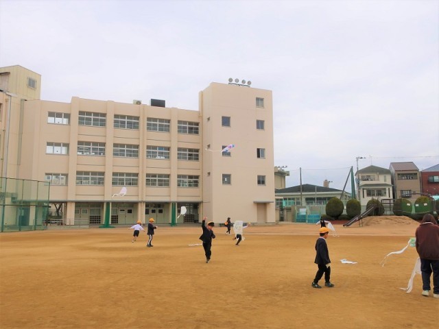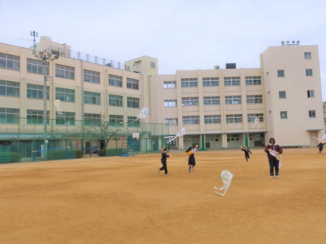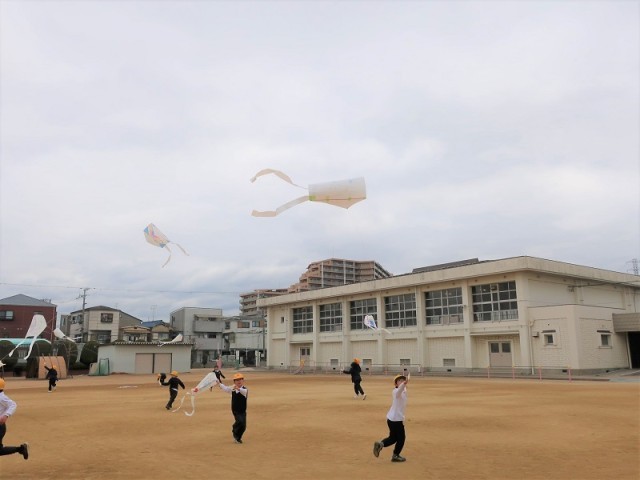 1年生の生活科授業の様子です。図画工作の時間で作った凧を飛ばしました。風が程よい強さで吹いていたので、よく上がりました。児童もとてもうれしそうにしていました。