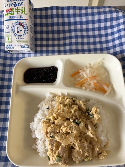 「親子丼」は、鶏肉、玉ねぎ、青ねぎを甘辛いだしで煮て、卵を加え、配食時にご飯を盛りつけた上にかけます。