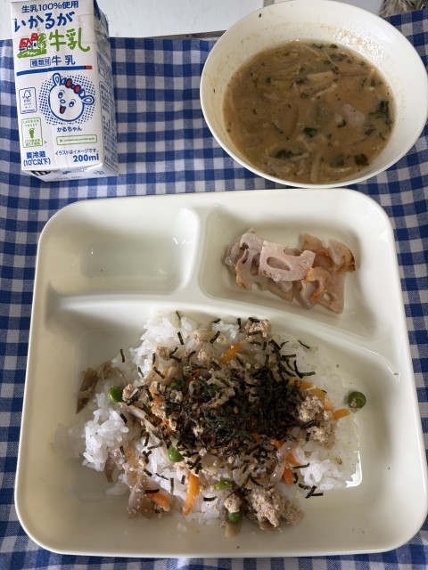 「鶏ごぼうご飯」は、しょうが汁で下味をつけた鶏ひき肉、つきこんにゃく、ごぼう、にんじん、グリンピースを使用しています。児童生徒に好評な混ぜご飯です。