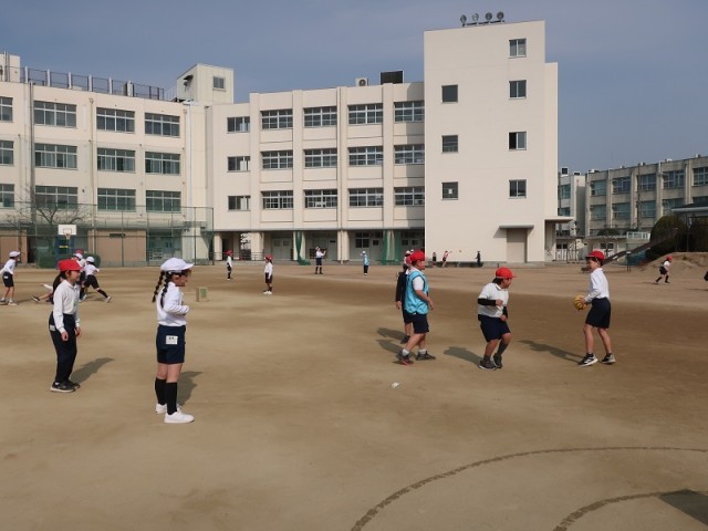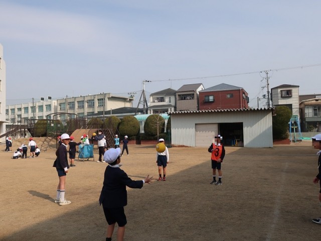 3年生の体育の授業風景です。ハンドボールの練習をしています。チームごとにパス練習や作戦会議を行っていました。試合は、チーム一体となって、協力して臨むことができました。