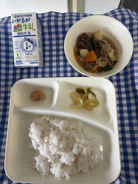 「肉じゃが」は、牛肉、じゃがいも、糸こんにゃく、玉ねぎ、人参、青みにさんどまめを使用した毎回好評な煮ものです。