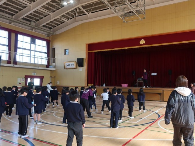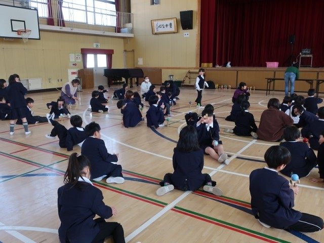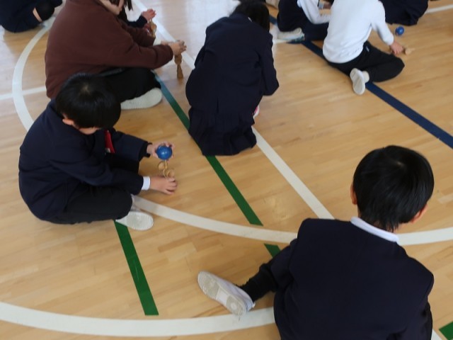 1年生のけん玉教室の様子です。先生のお手本を見ながら、色々な技に挑戦しています。時に一人で黙々と、時にお友達と協力しながら、お題を進めていました。