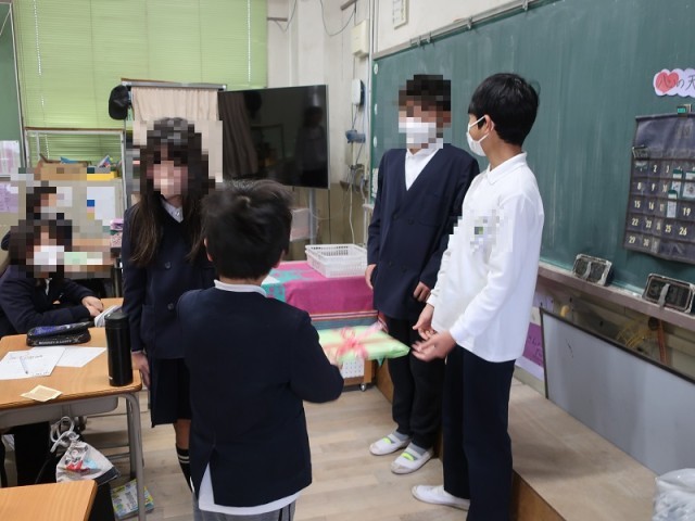 先日の「卒業を祝う会」に続きまして、6年生からぞうきんの引き渡しがありました。このぞうきんは、6年生が家庭科の授業で1枚1枚丁寧に作ったぞうきんです。「このぞうきんを使って学校をピカピカにしてください」というメッセージもありました。